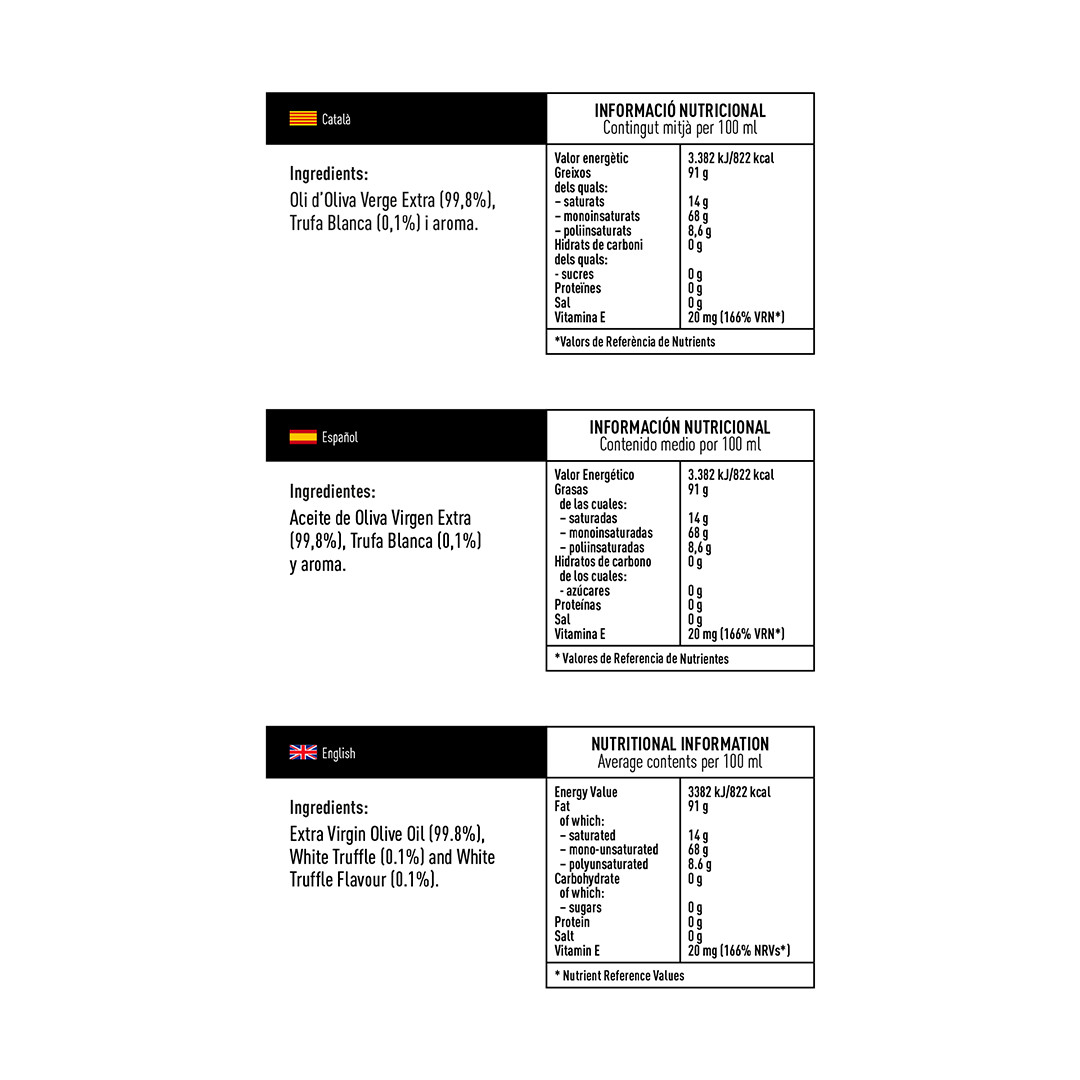 Cata : White truffle: Rich and fragrant with layered aromas.Black truffle: Intense, deep, and earthy.