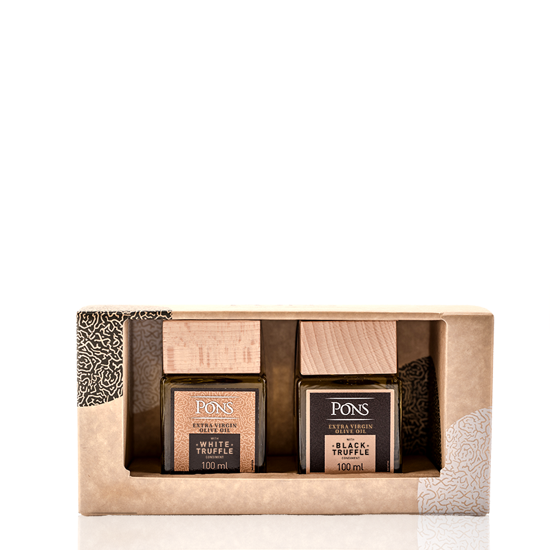 Gift box with two 100 ml bottles of olive oil infused with Black Truffle and White Truffle, made from late-harvest Arbequina olives. Presented in boutique format, this duo offers two intensely aromatic oils: one with a deep, earthy profile that evokes the essence of black truffle, and another with elegant and complex notes reminiscent of the delicacy of white truffle. An exquisite pairing to enhance pasta, risottos, carpaccios, eggs, meats, and foie gras.
