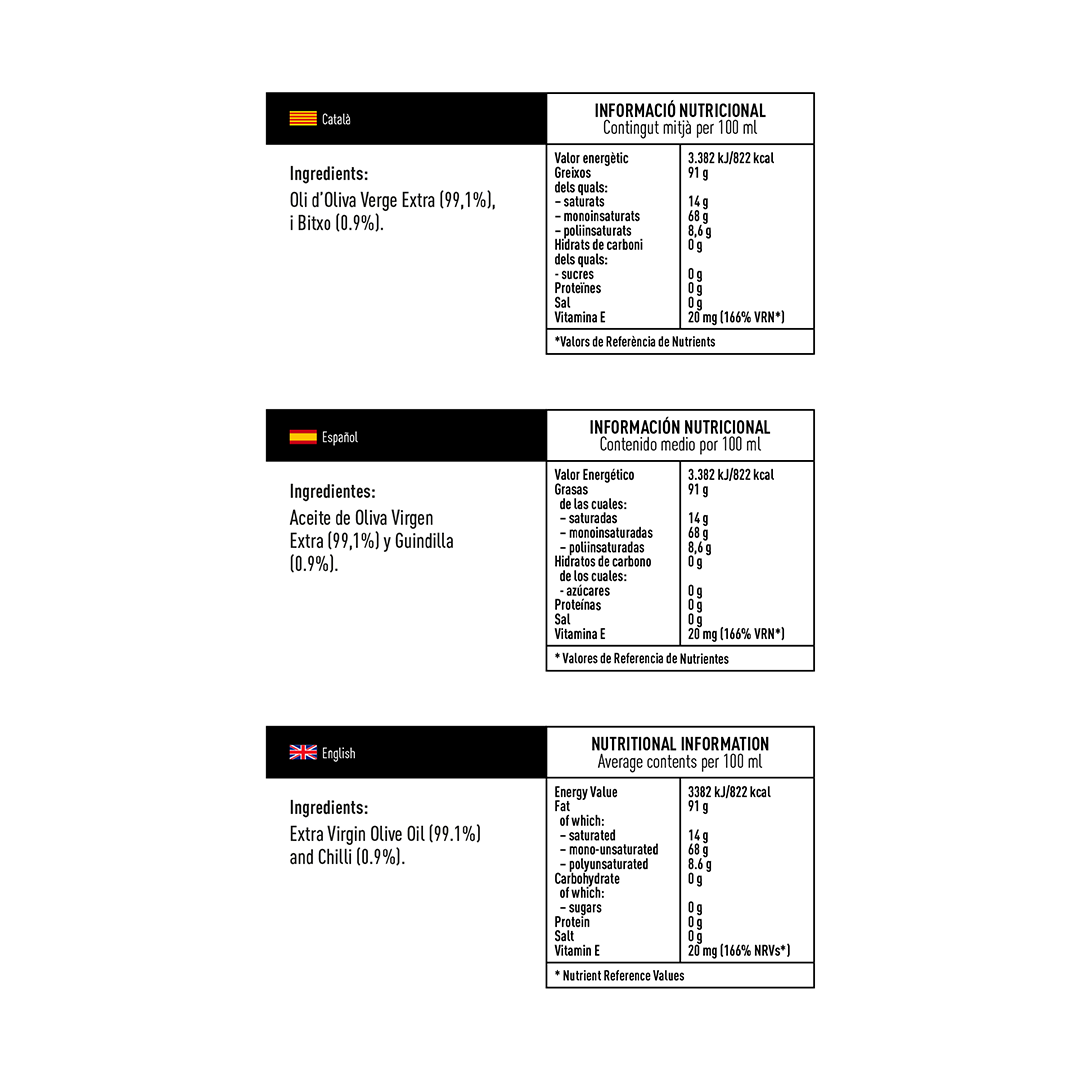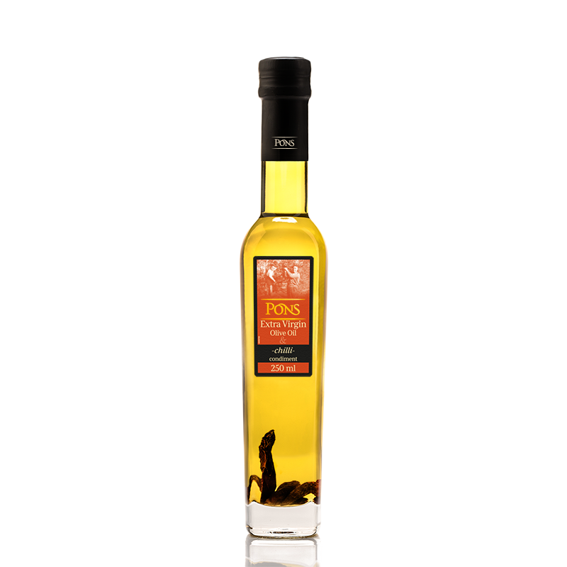 Olive Oil Infused with Chilli. An Arbequina extra virgin olive oil made on our farm, made with late harvest olives so as not to transfer intensity and be able to merge perfectly with the spicy touches of Chilli. An intense oil that will brighten fish, pastas, prawns, shellfish, tartar, creams and white meats.