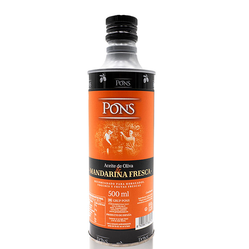 3. Aceite de Oliva cítrico con Mandarina 500l, elaborado con aceitunas arbequinas y mandarinas frescas. Un aceite muy mediterráneo con toque cítrico que hará sus delicias culinarias en ensaladas de rúcula, ensaladas de fruta, helados de vainilla, todo tipo de repostería.