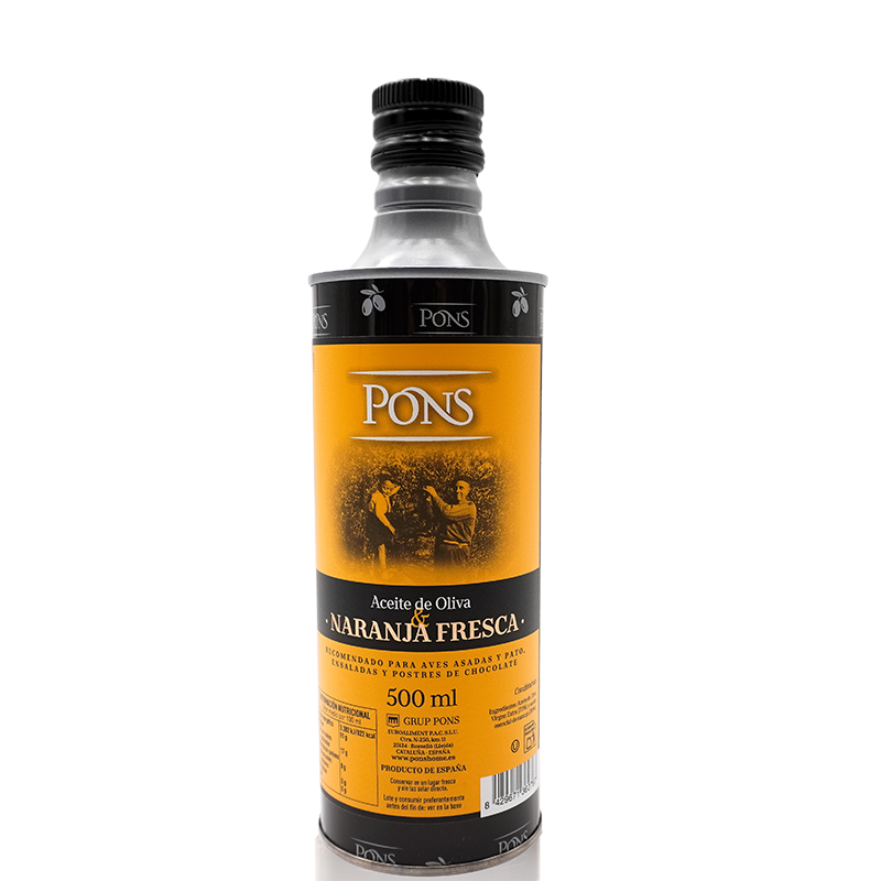 1. Aceite de Oliva cítrico con Naranja 500ml, elaborado con aceitunas arbequinas y naranjas frescas. Un aceite muy mediterráneo con toque cítrico que hará sus delicias en ensaladas, carne blanca, pescado, arroz con leche, repostería y especialmente chocolate.